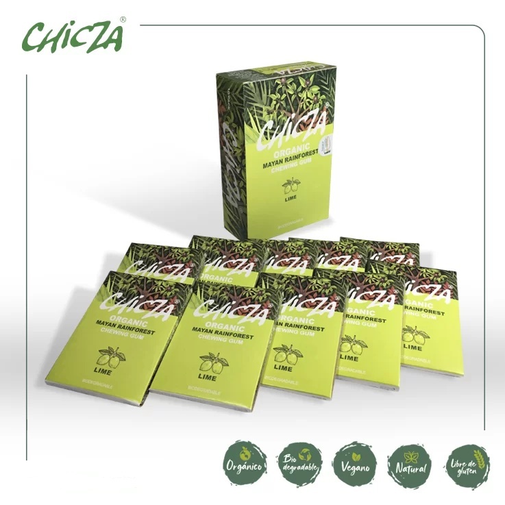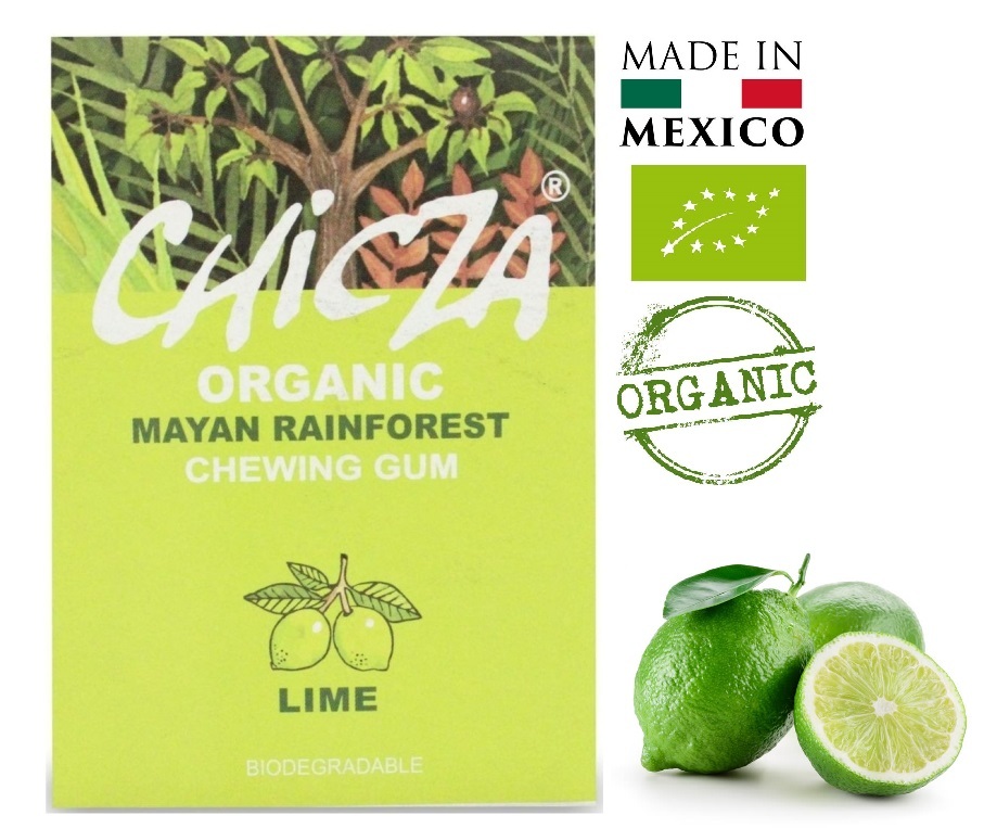 Chicza - это первая и единственная в мире на 100% биоразлагаемая органическая жевательная резинка, в то же время не содержащая глютена, полностью растительная и натуральная. Натуральная жевательная основа, получаемая из сока дерева Чикозапоте (саподила), которое может достигать 30 метров в высоту и произрастает во втором по величине лесу на американском континенте - Гран-Петене (тропическом лесу майя), считающемся вторым зеленым легким мира после тропических лесов Амазонки. Приготовлено без использования вредных искусственных подсластителей. Она сертифицирована как органическая и биоразлагаемая и производится консорциумом кооперативов по схеме справедливой торговли Fair Trade.