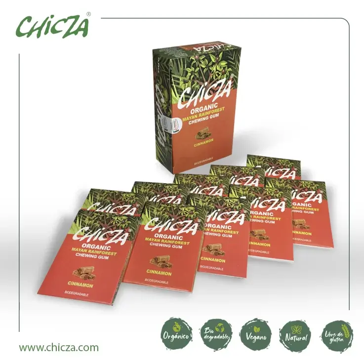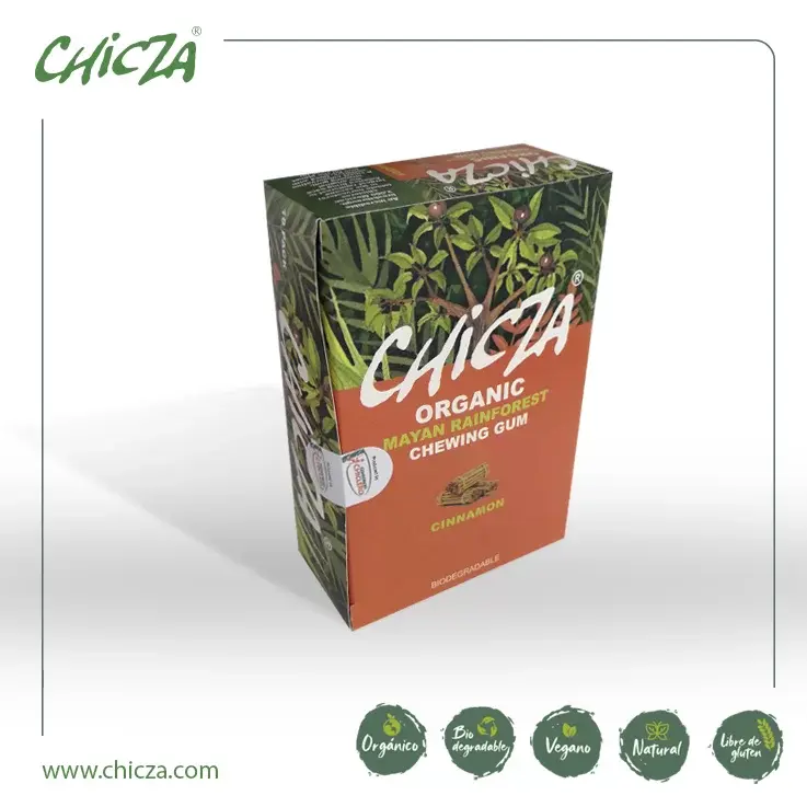 Chicza - это первая и единственная в мире на 100% биоразлагаемая органическая жевательная резинка, в то же время не содержащая глютена, полностью растительная и натуральная. Натуральная жевательная основа, получаемая из сока дерева Чикозапоте (саподила), которое может достигать 30 метров в высоту и произрастает во втором по величине лесу на американском континенте - Гран-Петене (тропическом лесу майя), считающемся вторым зеленым легким мира после тропических лесов Амазонки. Приготовлено без использования вредных искусственных подсластителей. Она сертифицирована как органическая и биоразлагаемая и производится консорциумом кооперативов по схеме справедливой торговли Fair Trade.